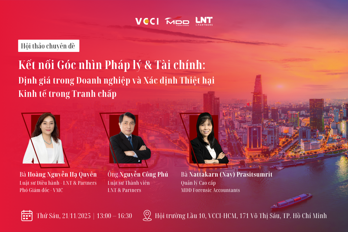 Khi những con số không chỉ là tài chính – mà còn là câu chuyện pháp lý phía sau.Trong M&A hay tranh chấp kinh tế, chỉ một khác biệt nhỏ giữa góc nhìn pháp lý và tài chính có thể khiến doanh nghiệp mất đi lợi thế.Hội thảo do VCCI-HCM, MDD Forensic Accountants và LNT & Partners phối hợp tổ chức – dành riêng cho các luật sư nội bộ, cố vấn pháp lý và đại diện doanh nghiệp – sẽ mang đến góc nhìn thực tế, giúp pháp lý và tài chính cùng “nói chung một ngôn ngữ”.