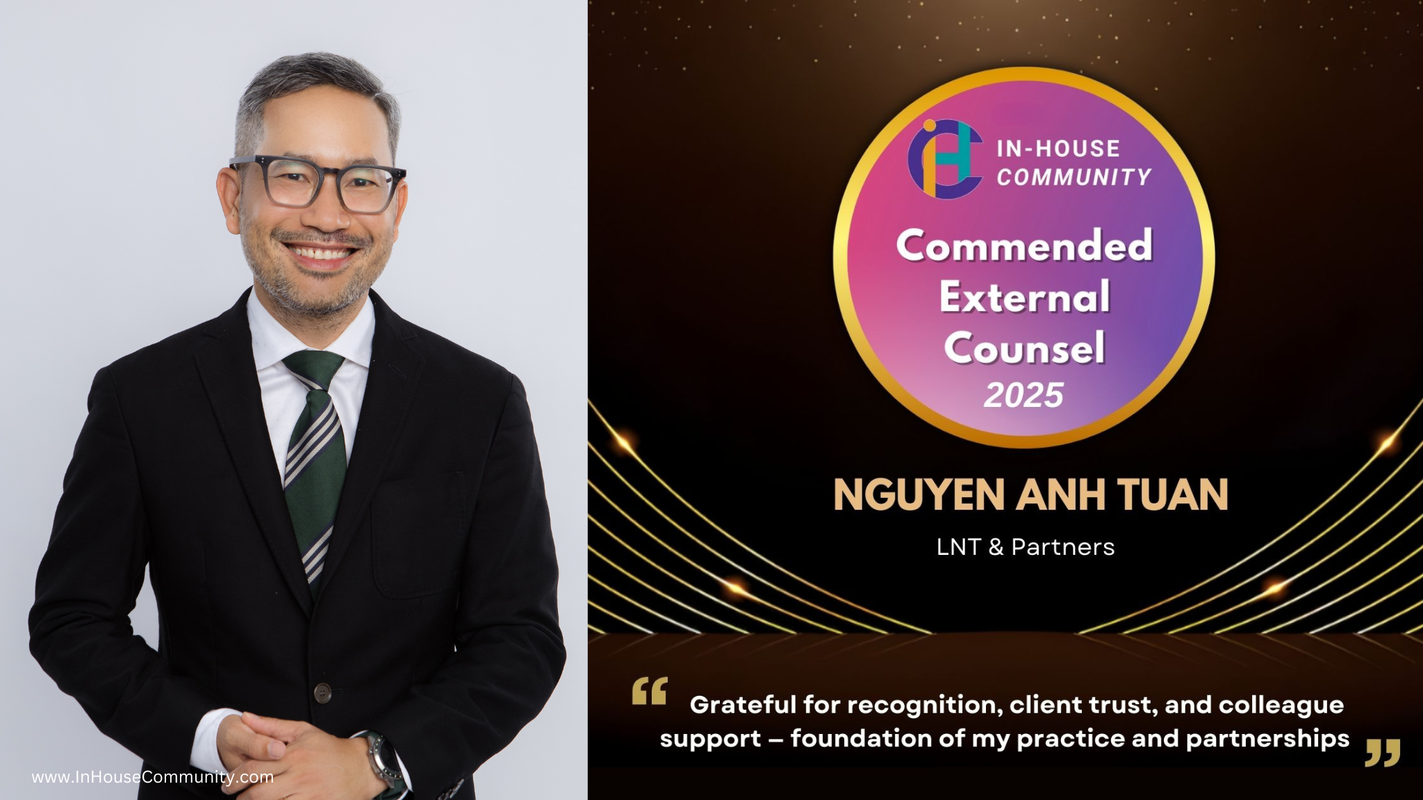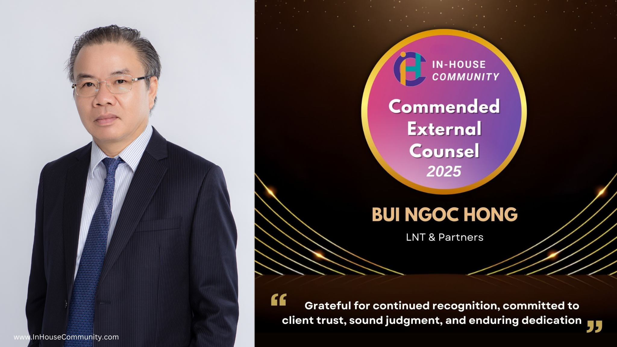 LNT & Partners trân trọng chúc mừng các Luật sư Thành viên của chúng tôi tiếp tục được In-House Community ghi nhận là Commended External Counsel (tạm dịch: Luật sư tư vấn xuất sắc) tại Counsel of the Year Awards 2025: Ông Bùi Ngọc Hồng, Bà Hoàng Nguyễn Hạ Quyên và Ông Nguyễn Anh Tuấn.