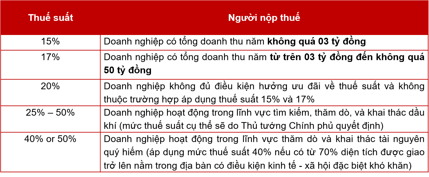 Mặc dù thuế suất áp dụng chung cho các doanh nghiệp vẫn giữ nguyên ở mức 20%, thống nhất với quy định của pháp luật hiện hành, Luật Thuế TNDN đã quy định hai mức thuế suất ưu đãi mới thấp hơn (15% và 17%) để hỗ trợ các doanh nghiệp vừa và nhỏ. Đối với các ngành công nghiệp khai thác tài nguyên, Luật Thuế TNDN duy trì thuế suất cao hơn với một số điều chỉnh.